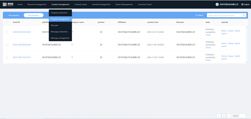 Tạo mới và chỉnh sửa chương trình với các loại: Chương trình đơn màn hình, Chương trình kép (dual-screen), Chương trình đồng bộ (synchronous) cho nhóm thiết bị.